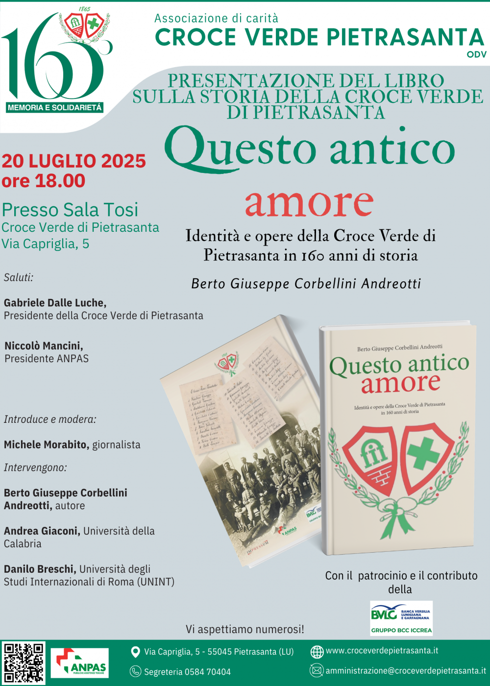 Ieri, 20 luglio, la Sala delle Adunanze "Maurizio Tosi" ha ospitato con un tutto esaurito la presentazione di un libro straordinario: "Questo antico amore. Identità ed opere della Croce Verde di Pietrasanta in 160 anni di storia" di Berto Giuseppe Corbellini Andreotti.